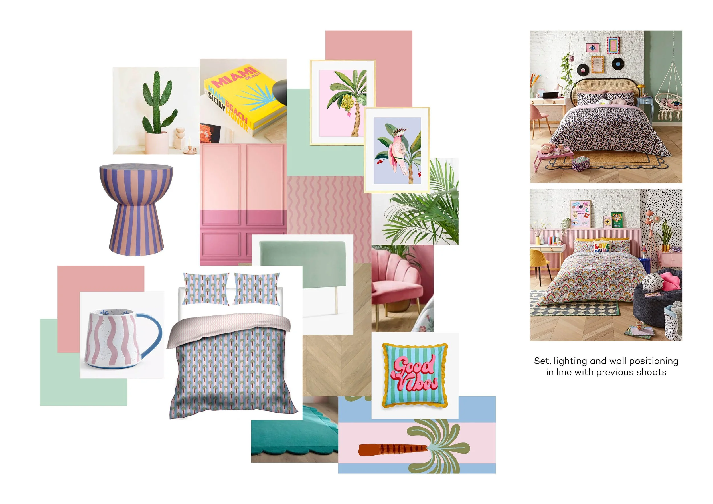 Launching the Electric Coast coverless duvet set, the campaign was a chance to celebrate pattern, colour and personality in a more expressive way than ever before. The moodboard focused on bold colour blocking, natural light and casual styling to capture a sense of joy. The final shoot brought that concept to life - a celebration of carefree coastal living and bold summer energy.